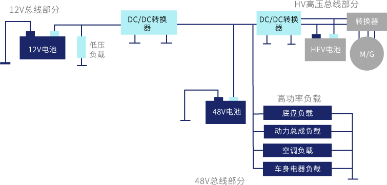 48V系统是在保留原有12V系统的基础上,再额外增加一套48V系统以供其它需要更大功率的功能使用,标准的48V系统由电机、电池组及DC-DC转换器组成。